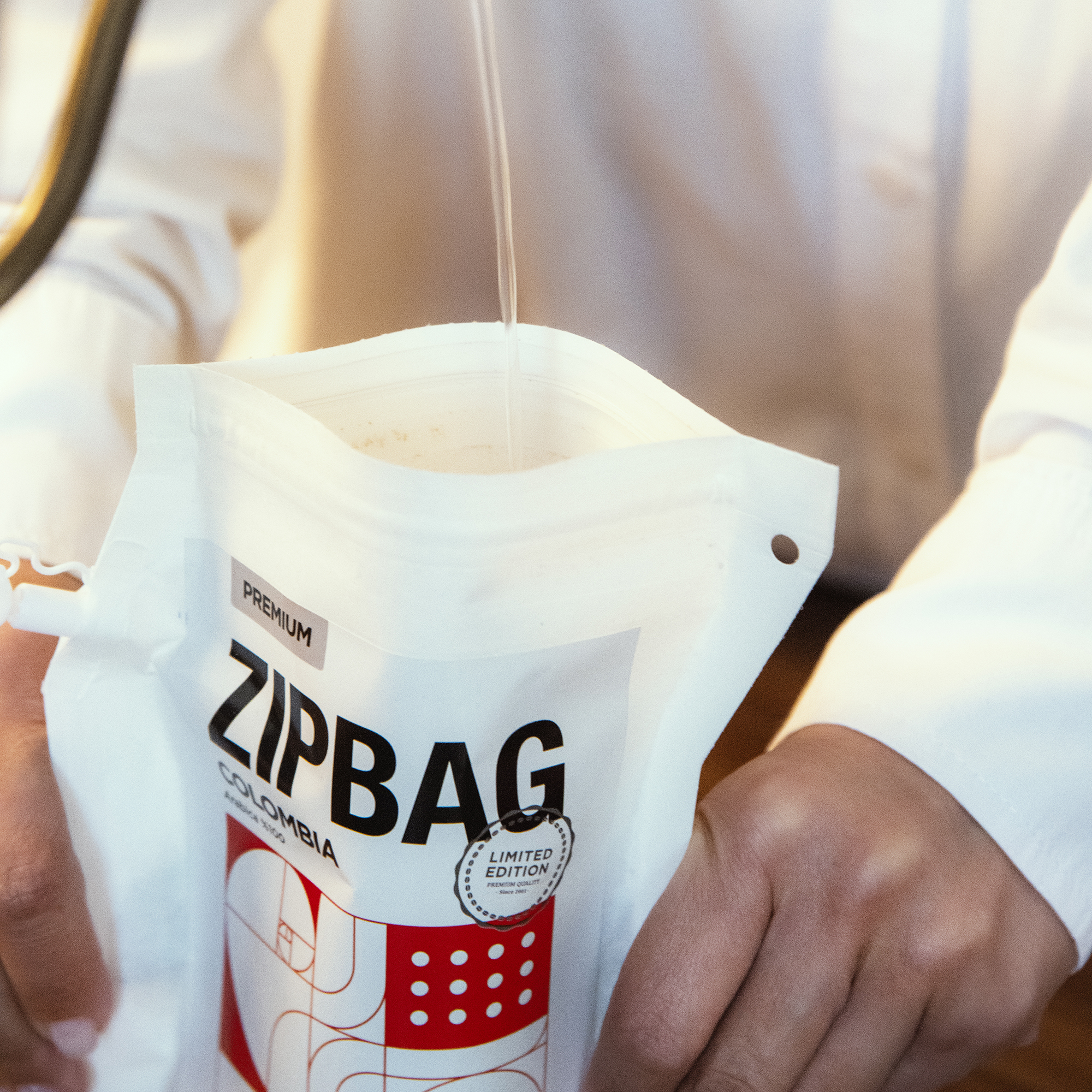 - After letting the coffee steep in the zip bag for 3 minutes, twist open the spout and pour the coffee into your cup.